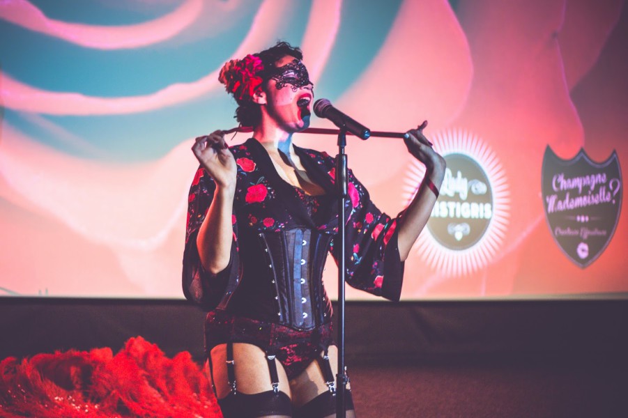 Après les amuse bouches, il est temps de monter dans la salle de cinéma. Sur le chemin de la salle, des filles en porte jarretelles se promènent, masques que les yeux, le tout est digne d’une soirée cabaret, on s’attend à voir débarquer une vendeuse de cigarettes à un moment ou un autre! Eh bien ces filles, ce sont les mannequins de la boutique de lingeries et accessoires vintage et coquins, Lady Mistigri à Strasbourg: bref, le thème de la soirée est parfaitement respecté!
