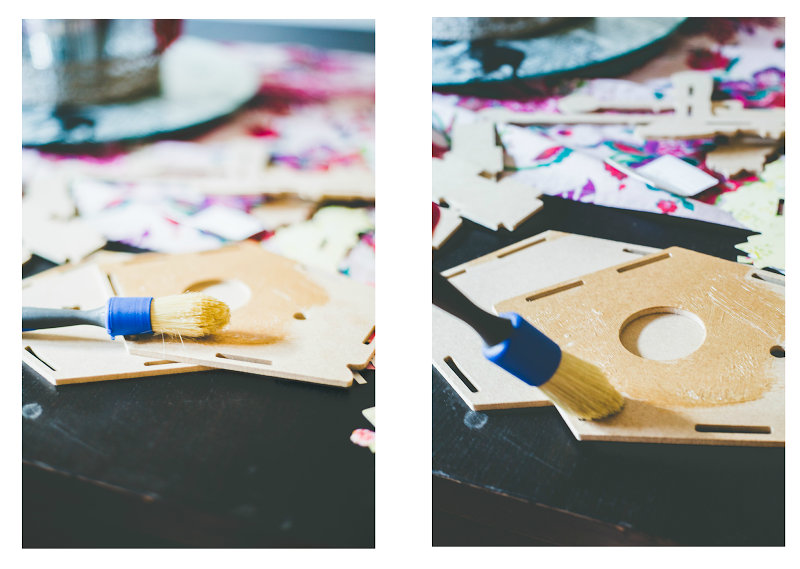 • A l’aide d’un pinceau, déposez de la colle sur une des faces de la pendule non assemblée