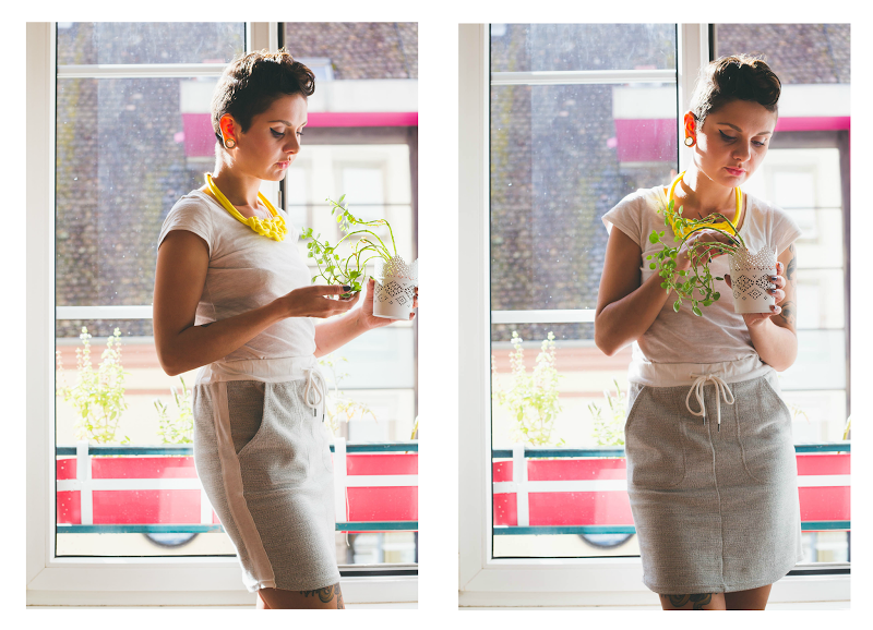 Je me suis donc fait un plaisir de vagabonder entre les rayons à la recherche d’une pièce qui bousculerait un petit peu mes habitudes, après tout, on change de saison, pourquoi pas tenter d’autres trucs? La pièce qui a attiré mon attention m’a vraiment étonnée puisque baaaaaah pas du tout dans mon style de prédilection, puisqu’il s’agissait ici d’une jupe grise type sportswear, très décontractée.