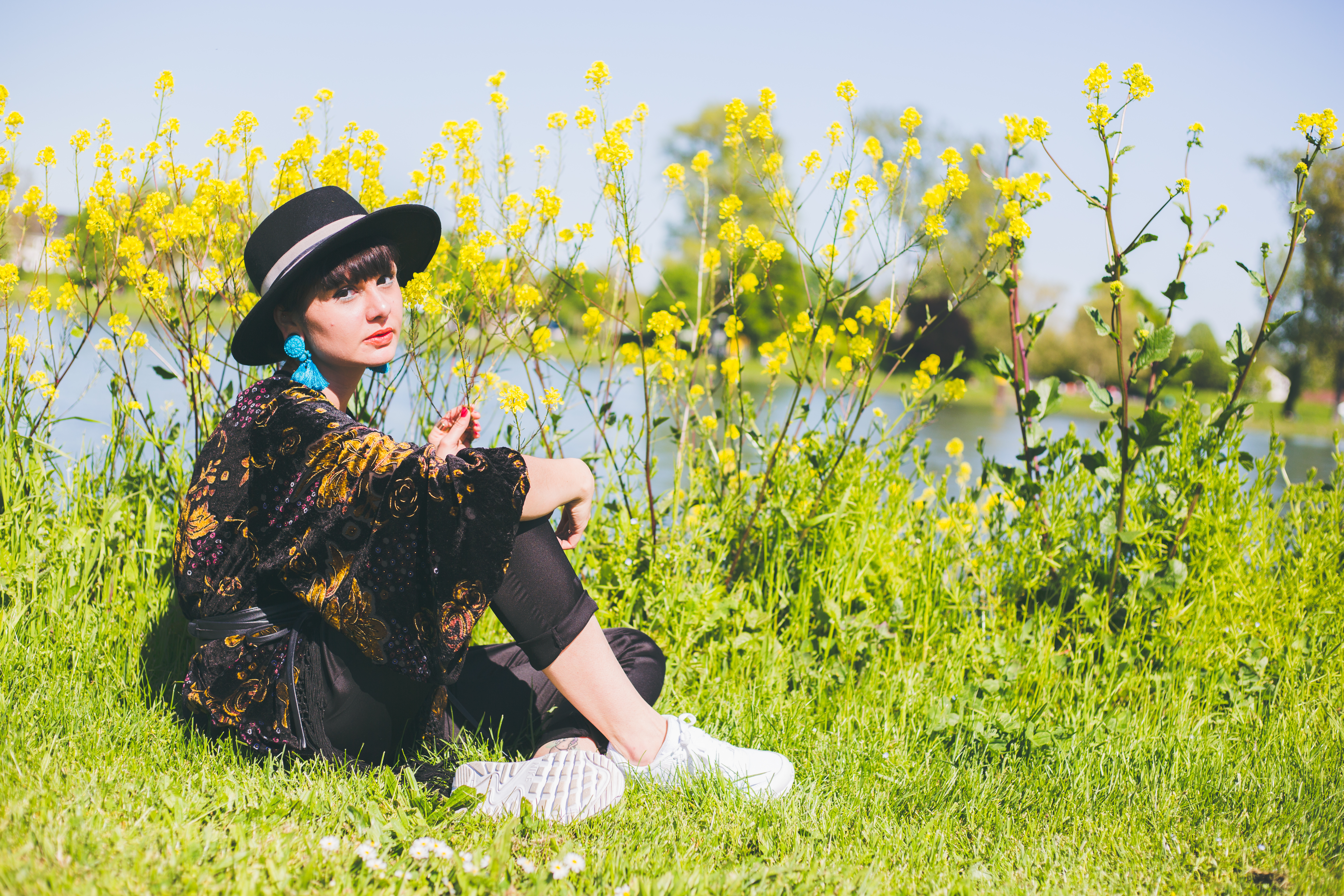 Bon, oui, je sais que ce look est un tantinet…black pour la saison, mais bon, j’ai choisit un endroit hyper fleurit pour shooter la tenue hein quand même, pis y’a aussi que je fais mes choix vestimentaires au feeling, j’aime changer tous les jours de style et ce jour-ci, je voulais mettre mon magnifique Kimono de velours Pimkie en valeur, non caché sous une veste ou un manteau!