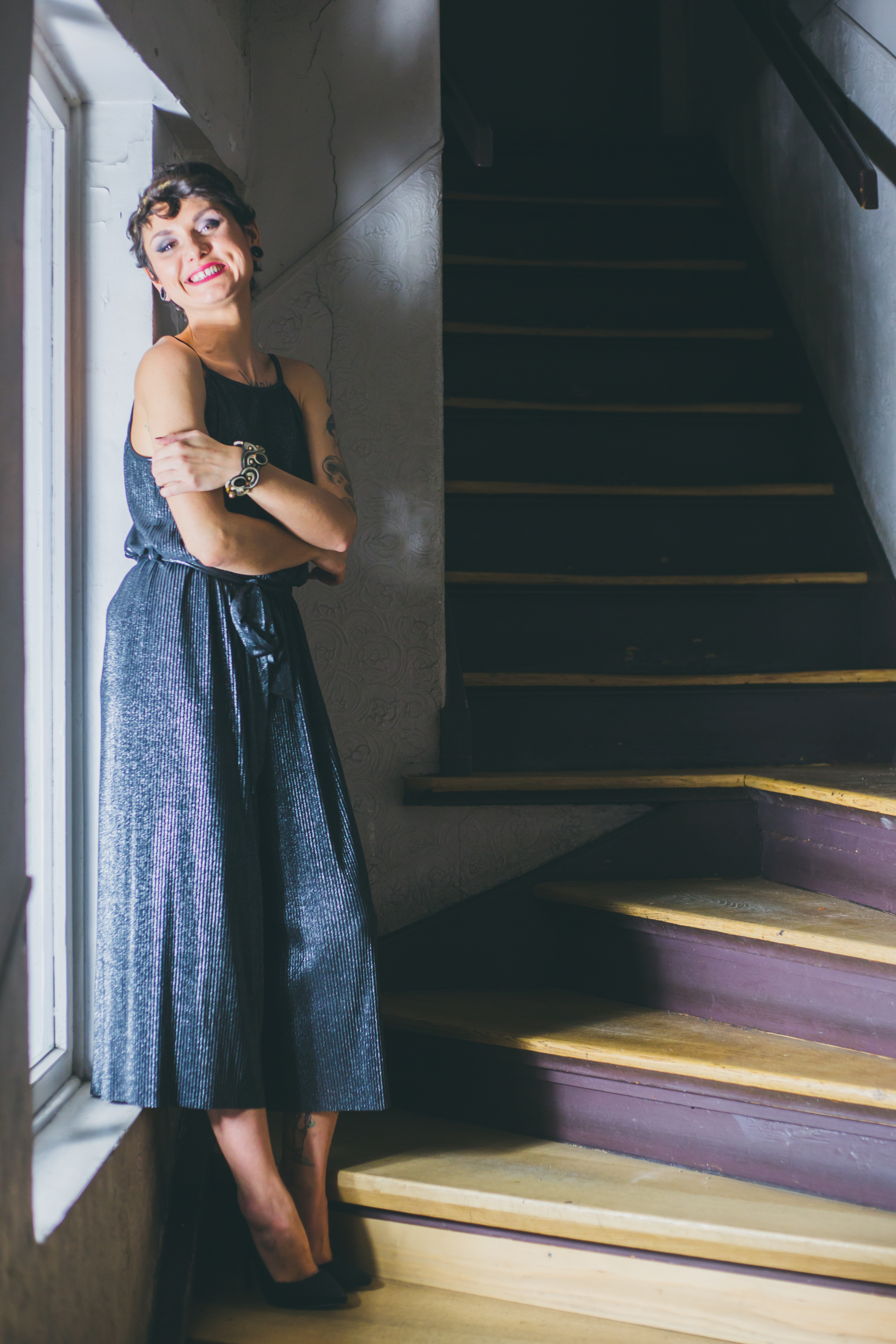 Blasée, je rends tout le tintouin pour sortir du magasin et rentrer chez moi bredouille, jusqu’à ce que surgisse de derrière les fagots une combinaison longue dont la coupe d’inspiration 70’s dont le haut me fait aussi un peu penser au haut d’une toge style Grecque, avec mon headband doré fait main par Graine de Beau M, le mélange gris, argent et or matchait à mort, alors qu’on pense qu’il ne faut pas marier les deux couleurs sous peine d’une faute de goût. A priori, nous ne sommes plus dans le 50’s donc vas-y chérie, ose mixer les couleurs, le mélange détonne presque à tous les coups, à condition de choisir des matières de qualité pour ne pas tomber dans le cheap à fond !