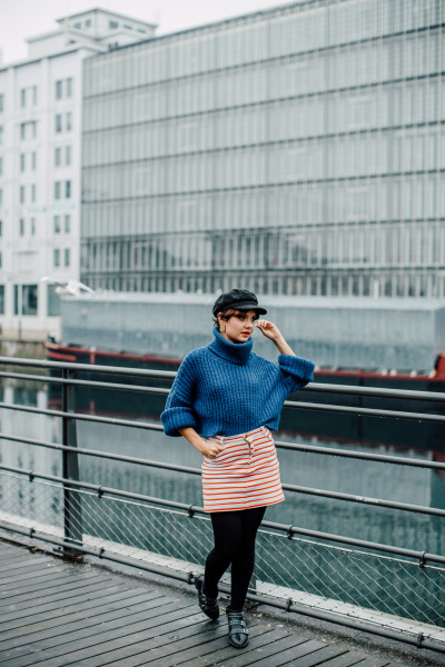 Que tu optes pour une jupe / un short / un pantalon ou un jean, tu peux un peu tout te permettre, tant (je le répète) que c’est une coupe taille haute et pas très évasée en bas. Je m’explique : le pull en impose, la maille est grosse, le col roulé est XXL, les manches, je t’en parle même pas ; donc si tu apportes de la masse à ta tenue, tu risques justement d’apporter trop de volume et de ce fait, alourdir ta silhouette !