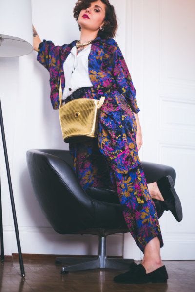 À mon grand étonnement : il m’a dit « ah mais elle te va super bien cette combi ! elle est très originale et il faut oser porter du barioler, mais tu la portes trop bien !  » OMAGAD CÉDRIC VALIDE ! Et si Cédric valide, c’est bon, je suis prête à affronter le regard de mes semblables dans la rue parce que moi perso…J’ADORE !! Je suis fan absolue du style de cette pièce WTF, je suis en amour devant le côté 80’s hyper marqué du fait des couleurs et de sa matière fluide en soie. Je pense qu’à une seule et unique chose : la porter au boulot, me balader dans les couloirs en roulant des mécaniques à fond les ballons ET surtout, agrémenter ce look de mon nouveau sac doré également made in  Vintage Place ! Trop de beauté, trop d’originalité, aucune uniformité : en bref, je suis MOI et ça fait du bien !