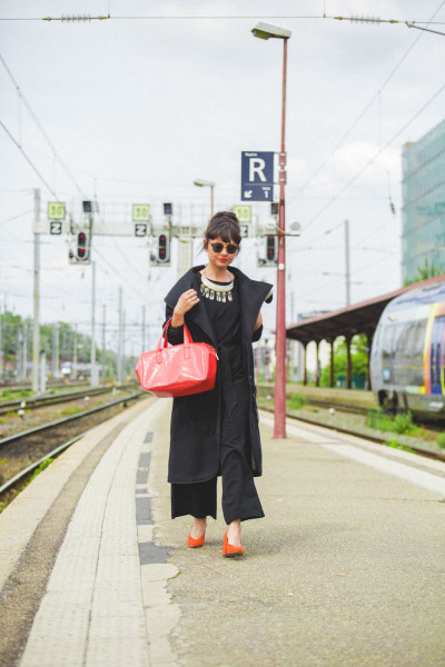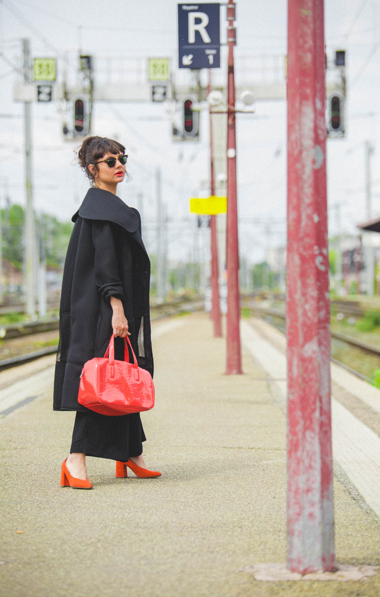 Tu l’auras compris, le latex est la marque de fabrique de Solyless, jouant avec les effets d’opacité et de transparence et mettant clairement les matériaux au coeur de l’attention. J’ai d’ailleurs sélectionné ce superbe manteau oversize en Néoprène dans le showroom, car elle m’a immédiatement tapé à l’oeil ! Sa coupe hyper moderne et son effet de transparence rendent un côté très classy à la pièce. J’ai décidé de la porter avec une combinaison, elle aussi overzise, mais cintrée à la taille par une ceinture. Pour éviter le côté amas de pièces – les deux étant assez larges – j’ai opté pour des talons colorés qui vont donner du pep’s à la silhouette, allonger la taille et finir d’apporter cette touche « chic » que m’a inspiré le manteau.